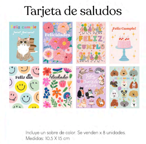 Tarjeta de saludo con diferentes inscripciones. Incluye sobre de color.